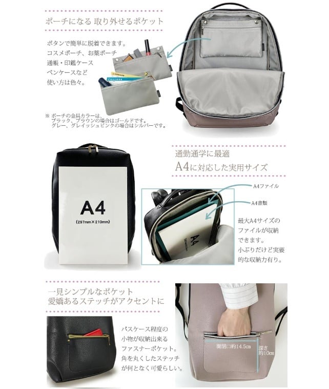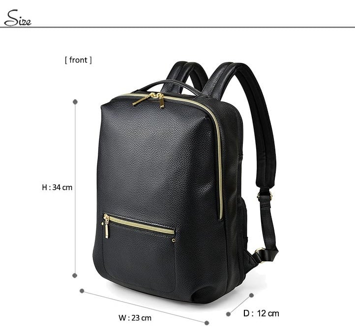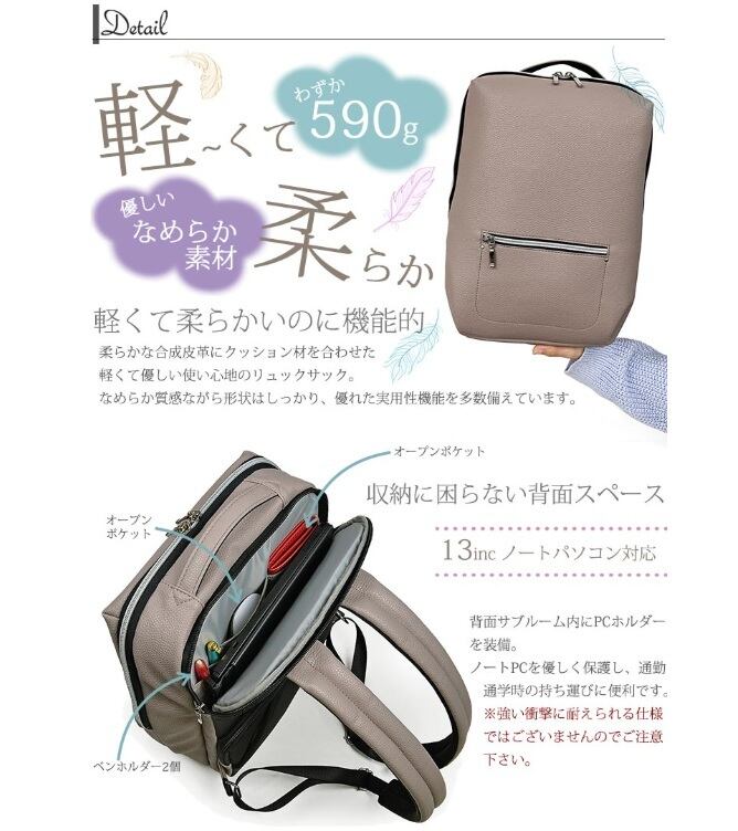 柔らかな合成皮革にクッション材を合わせた軽い使い心地のリュックサック。