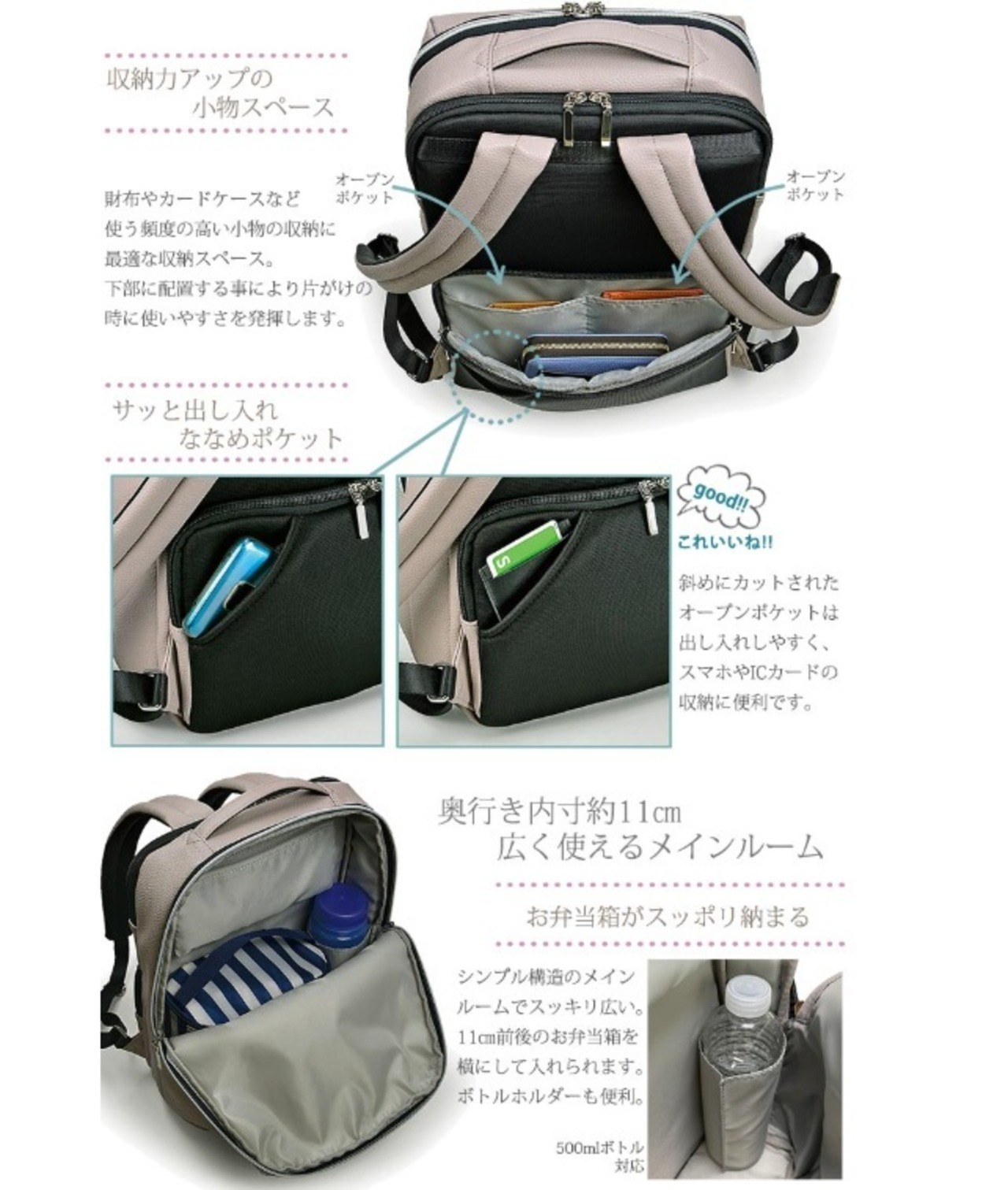 【本体背面】ななめオープンポケット×1、ラウンドファスナーポケット×1 (内装にオープンポケット×2)